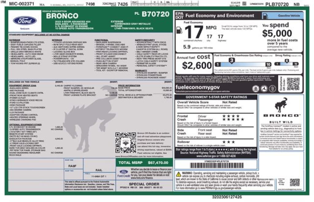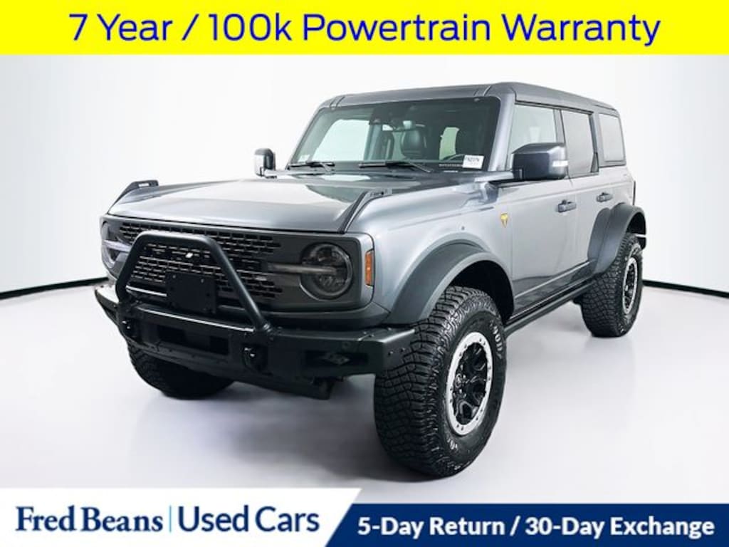 2023 Ford Bronco Badlands 2.7L EcoBoost V6 10-Speed Automatic 4WD 4D Sport Utility Carbonized Gray Metallic Ford Gold Certified, 7 Year / 100k Powertrain Warranty, 12 Month / 12,000 Mile Comprehensive Warranty, 12" LCD Capacitive Touchscreen w/Swipe Capability, 2 Smart Charging USB Ports In Dashboard, 2-Door Intelligent Access w/Lock/Unlock, 360-Degree Camera, 4.7 Final Drive Ratio, Adaptive Cruise Control, Additional Sound Deadening, Ambient Footwell Lighting, Auto-Dimming Interior Rear-View Mirror, Connected Built-In Navigation, Dr & Pass Illuminated Sliding Visor Vanity Mirrors, Dual-Zone Electronic Automatic Temperature Control, Enhanced Voice Recognition, Equipment Group 334A Lux Package, Evasive Steering Assist, Front Parking Sensors, Front Row Heated Seats, Hard Top Sound Deadening Headliner, Heated door mirrors, Heated Steering Wheel, High Clearance Fender Flares, High Clearance Suspension, Information on Demand Panel, Position-Sensitive Bilstein Shock Absorbers, Power door mirrors, Power Outlet - Back Side of Center Floor Console, Power windows, Radio: B&O Sound System by Bang & Olufsen, Rear Parking Sensors, Remote keyless entry, Sasquatch Package, Sideview Mirrors, SiriusXM Radio w/360L, Tilt steering wheel, Universal Garage Door Opener, Wheels: 17" Black High Gloss-Painted Aluminum, Wireless Charging Pad.
