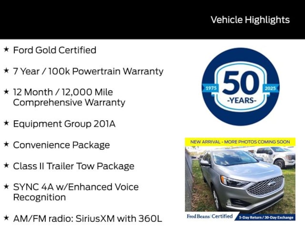 Recent Arrival! 2024 Ford Edge SEL EcoBoost 2.0L I4 GTDi DOHC Turbocharged VCT 8-Speed Automatic AWD 4D Sport Utility Iconic Silver Metallic Ford Gold Certified, 7 Year / 100k Powertrain Warranty, 12 Month / 12,000 Mile Comprehensive Warranty, 110V/150W AC Power Outlet, ActiveX Trimmed Heated Bucket Seats, AM/FM radio: SiriusXM with 360L, Automatic temperature control, Class II Trailer Tow Package, Convenience Package, Equipment Group 201A, Fog Lamps w/Iconic Silver Bezel, Front Bucket Seats, Front dual zone A/C, Heated door mirrors, Heated front seats, Heated Steering Wheel, Perimeter Alarm, Power door mirrors, Power driver seat, Power Liftgate, Power passenger seat, Power windows, Rear Parking Sensors, Rear window defroster, Rear window wiper, Remote keyless entry, Remote Start System, Speed control, SYNC 4A w/Enhanced Voice Recognition, Tilt steering wheel, Universal Garage Door Opener (UGDO), Wheels: 18" Sparkle Silver-Painted Aluminum, Wireless Charging Pad. 21/28 City/Highway MPG