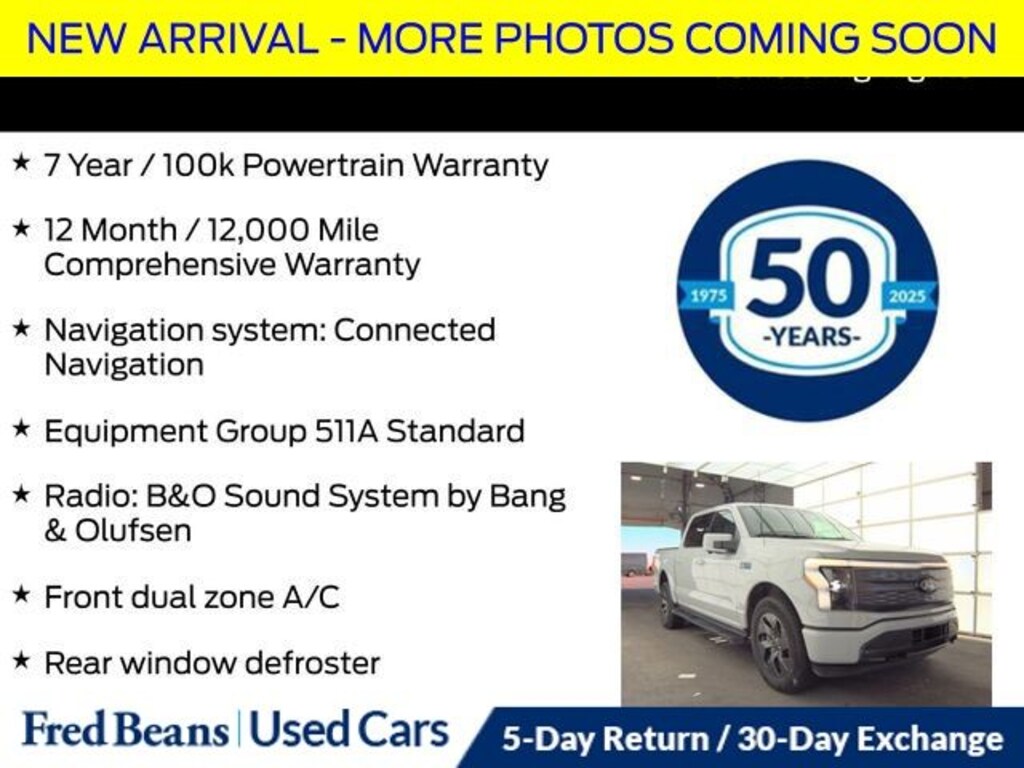 Recent Arrival! 2024 Ford F-150 Lightning Lariat 131 kwh extended battery 511a package Electric Motor Single-Speed Automatic AWD 4D Crew Cab Avalanche Ford Gold Certified, 7 Year / 100k Powertrain Warranty, 12 Month / 12,000 Mile Comprehensive Warranty, Blue Cruise, Adjustable pedals, Automatic temperature control, Equipment Group 511A Standard, Front Bucket Seats, Front dual zone A/C, Heated door mirrors, Heated steering wheel, Leather-Trimmed Heated & Ventilated Seats (DISC), Memory seat, Navigation system: Connected Navigation, Plastic Drop-In Bedliner, Power door mirrors, Power driver seat, Power moonroof, Power passenger seat, Power windows, Radio: B&O Sound System by Bang & Olufsen, Rear window defroster, Remote keyless entry, Speed control, SYNC 4A w/Enhanced Voice Recognition, Tilt steering wheel, Turn signal indicator mirrors, Wheels: 20" Alloy Dark Carbonized Gray. 78/63 City/Highway MPG