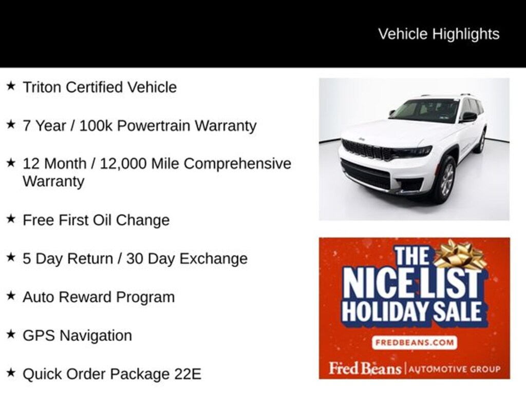 This Jeep Grand Cherokee L Limited is a Triton Certified vehicle, meaning it has undergone a rigorous inspection and comes with a comprehensive warranty to give you peace of mind. With a 7-year/100,000-mile powertrain warranty and a 12-month/12,000-mile comprehensive warranty, you can drive with confidence, knowing your investment is protected.