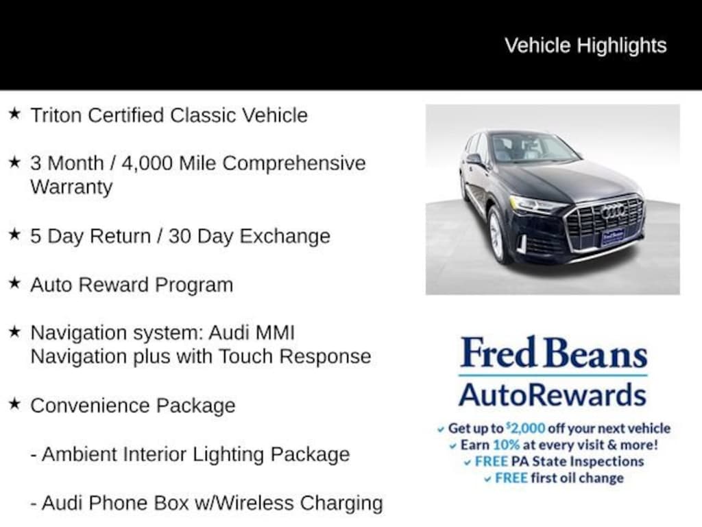 As a Triton Certified Classic Vehicle, this Audi Q7 has undergone a rigorous inspection process to ensure it meets the highest standards of quality and reliability. With a comprehensive warranty and a commitment to customer satisfaction, you can drive with confidence, knowing that your investment is protected.