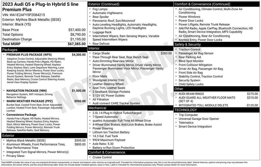 Recent Arrival! 2023 Audi Q5 e 55 Premium S Line 2.0L Turbocharged 7-Speed Automatic S tronic quattro 4D Sport Utility Mythos Black Metallic Great Service History, Remainder of Factory Warranty, Auto Reward Program, 2.0L Turbocharged, Audi Active Lane Assist, Audi Connect PRIME & PLUS, Bang & Olufsen Sound System w/3D Sound, Convenience Package, Deluxe Pre-Entry Climate Control, Hands-On Detection Steering Wheel, Manual Rear Side Window Sunshades, MMI Navigation Plus, Navigation Package, Panoramic Sunroof, Power Adjustable Steering Column, Premium Plus Package, Top View Camera System, Traffic Jam Assist, Ventilated Front Seats, Warm Weather Package.