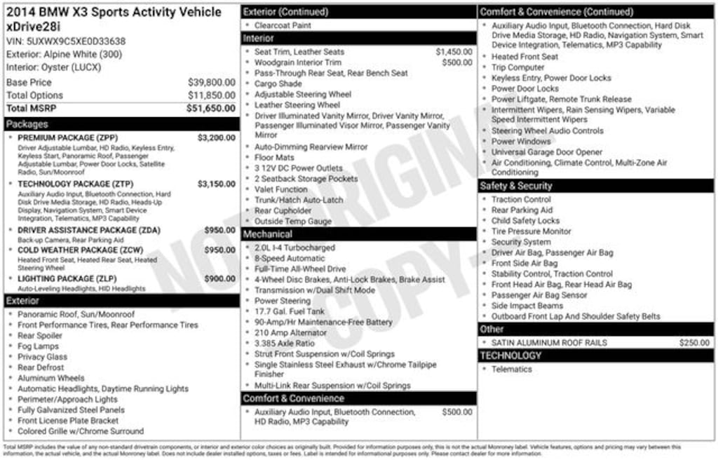 2014 BMW X3 xDrive28i 2.0L I4 TwinPower Turbo 8-Speed Automatic Steptronic AWD 4D Sport Utility Alpine White Local Trade, Adaptive Light Control, Alloy wheels, AM/FM radio, Cold Weather Package, Comfort Access Keyless Entry, Driver Assistance Package, Head-Up Display, Heated Front Seats, Heated Rear Seats, Heated Steering Wheel, Lighting Package, Lumbar Support, Navigation System, Nevada Leather Upholstery, Panoramic Moonroof, Park Distance Control, Power door mirrors, Power driver seat, Power Liftgate, Power passenger seat, Power windows, Premium Package, Rear window wiper, Rear-View Camera, Remote keyless entry, Retractable Headlight Washers, Satellite Radio, Technology Package, Tilt steering wheel, Xenon Headlights. 21/28 City/Highway MPG
