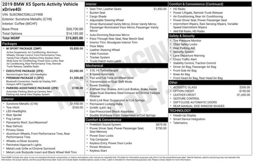 2019 BMW X5 xDrive40i 3.0L I6 DOHC 24V TwinPower Turbo 8-Speed Automatic AWD 4D Sport Utility Sunstone Metallic Local Trade, 3 Month / 4,000 Mile Comprehensive Warranty, Ford Blue Advantage Certified, 4-Zone Automatic Climate Control, Adaptive M Suspension, Aerodynamic Kit, Comfort Access Keyless Entry, Enhanced USB & Bluetooth, Executive Package, Gesture Control, Head-Up Display, Heated & Cooled Cup Holders, Heated Front Seats, High-Gloss Shadowline Roof Rails, Icon Adaptive LED Headlights w/Laserlight, M Sport Package, M Sport Package (337), M Steering Wheel, Memory seat, Parking Assistance Package, Parking Assistant Plus, Power driver seat, Power moonroof, Power passenger seat, Power windows, Premium Package 2, Rear Manual Side Window Shades, Rear window defroster, Rear-View Camera, Remote Engine Start, Remote keyless entry, Shadowline Exterior Trim, SiriusXM Satellite Radio w/1 Year All Access, Soft-Close Automatic Doors, Speed control, Surround View w/3D View, Vernasca Leather Upholstery, Wheels: 20" x 9" M Star-Spoke Bi-Color, WiFi Hotspot, Wireless Charging, Without Lines Designation Outside. 20/26 City/Highway MPG
