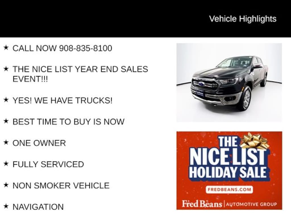 CALL NOW 908-835-8100, THE NICE LIST YEAR END SALES EVENT!!!, YES! WE HAVE TRUCKS!, BEST TIME TO BUY IS NOW, ONE OWNER, FULLY SERVICED, NON SMOKER VEHICLE, NAVIGATION, WARRANTY INCLUDED, LOW MILES, HEATED SEATS, CALL NOW!!! 908-835-8100, Free First Oil Change, 5 Day Return / 30 Day Exchange, Auto Reward Program, Great Service History, 4WD, ABS brakes, Electronic Stability Control, Exterior Parking Camera Rear, Front dual zone A/C, Front fog lights, Heated door mirrors, Heated front seats, Illuminated entry, Remote keyless entry, Security system, Traction control. Recent Arrival! 2019 Ford Ranger Lariat EcoBoost 2.3L I4 GTDi DOHC Turbocharged VCT 10-Speed Automatic 4WD 4D Crew Cab Shadow Black