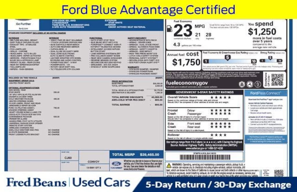 Recent Arrival! 2020 Ford Edge SEL EcoBoost 2.0L I4 GTDi DOHC Turbocharged VCT 8-Speed Automatic AWD 4D Sport Utility White 3 Month / 4,000 Mile Comprehensive Warranty, Ford Blue Advantage Certified, ActiveX Seating Material Heated Bucket Seats, Adaptive Cruise Control w/Stop & Go, Automatic temperature control, Cold Weather Package, Equipment Group 201A, Evasive Steering Assist, Foot-Activated Hands-Free Liftgate, Ford Co-Pilot360 Assist+, Front & Rear Floor Liners, Heated door mirrors, Heated Steering Wheel, Lane Centering, Navigation System, Power driver seat, Wheels: 18" Sparkle Silver-Painted Aluminum, Windshield Wiper De-Icer. 21/28 City/Highway MPG