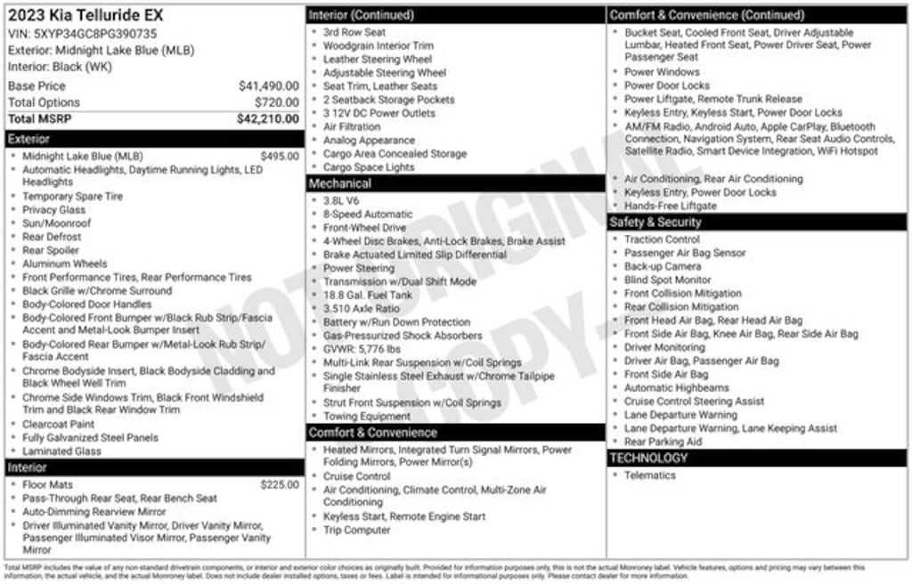 2023 Kia Telluride EX 3.8L V6 DGI DOHC Dual CVVT 8-Speed Automatic FWD 4D Sport Utility Midnight Lake Blue Local Trade, 3rd row seats: split-bench, Apple CarPlay & Android Auto, Automatic temperature control, Exterior Parking Camera Rear, Front dual zone A/C, Heated & Ventilated Front Bucket Seats, Heated door mirrors, Leather Seat Trim, Navigation System, Power Liftgate, Power moonroof, Rear air conditioning, Rear window defroster, Rear window wiper, Speed control, Tilt steering wheel, Wheels: 20" x 7.5" Black Finish. 20/26 City/Highway MPG