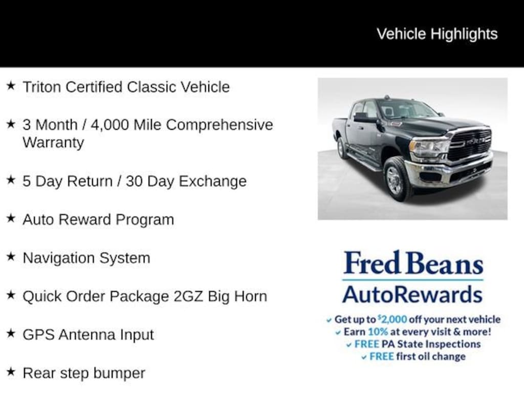 This Ram 2500 Big Horn is a Triton Certified Classic Vehicle, meaning it has undergone a rigorous inspection and comes with a comprehensive warranty, giving you the peace of mind you deserve. With its impressive capabilities, refined styling, and uncompromising attention to detail, this truck is poised to exceed your expectations.