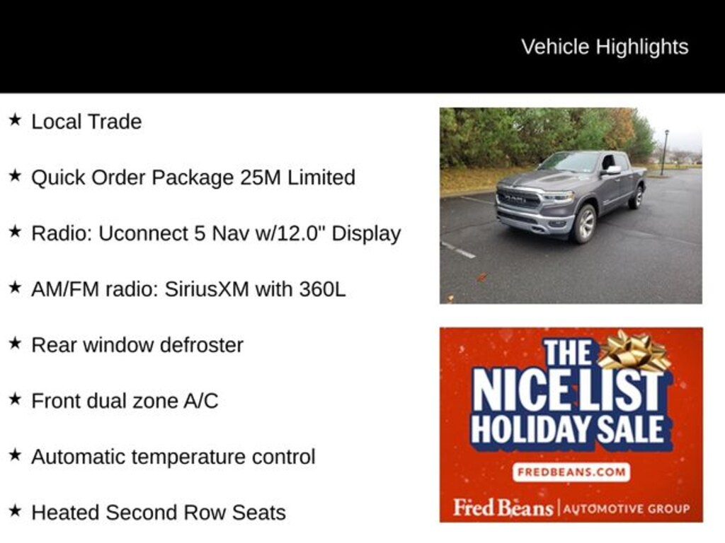 Recent Arrival! 2022 Ram 1500 Limited HEMI 5.7L V8 Multi Displacement VVT 8-Speed Automatic 4WD 4D Crew Cab Granite Crystal Metallic Clearcoat Local Trade, Adjustable pedals, AM/FM radio: SiriusXM with 360L, Anti-Spin Differential Rear Axle, Apple CarPlay/Android Auto, Automatic temperature control, Driver Seat Memory, Front dual zone A/C, Front fog lights, Garage door transmitter, Heated door mirrors, Heated Second Row Seats, Heated Steering Wheel, ParkView Rear Back-Up Camera, Pedal memory, Power 8-Way Driver & Passenger Seats, Power door mirrors, Power driver seat, Power windows, Power-Folding Mirrors, Premium Leather Trimmed Bucket Seats, Quick Order Package 25M Limited, Radio: Uconnect 5 Nav w/12.0" Display, Rain sensing wipers, Rear window defroster, Speed control, Tilt steering wheel, Turn signal indicator mirrors, Ventilated Front Seats, Wheels: 20" x 9" Polished w/Inserts (DISC).