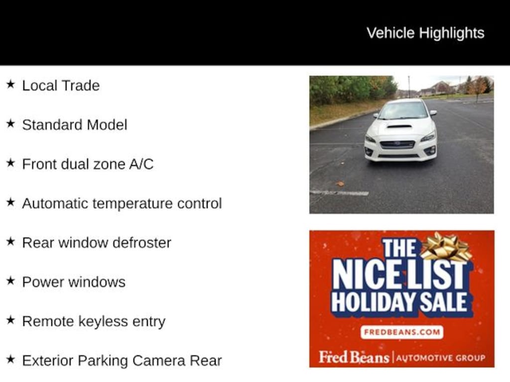 Recent Arrival! 2016 Subaru WRX STi 2.5L DOHC Intercooled High-Boost DAVCS Close-Ratio 6-Speed Manual AWD 4D Sedan Crystal White Pearl Local Trade, Alcantara Upholstery w/Leather Bolsters, Automatic temperature control, Exterior Parking Camera Rear, Front Bucket Seats, Front Center Armrest, Front dual zone A/C, Front fog lights, Heated door mirrors, Power door mirrors, Power windows, Rear window defroster, Remote keyless entry, Speed control, Spoiler, Sport steering wheel, Standard Model, Tilt steering wheel, Turn signal indicator mirrors, Wheels: 18" x 8.5J Aluminum Alloy/Dark Gray Finish.
