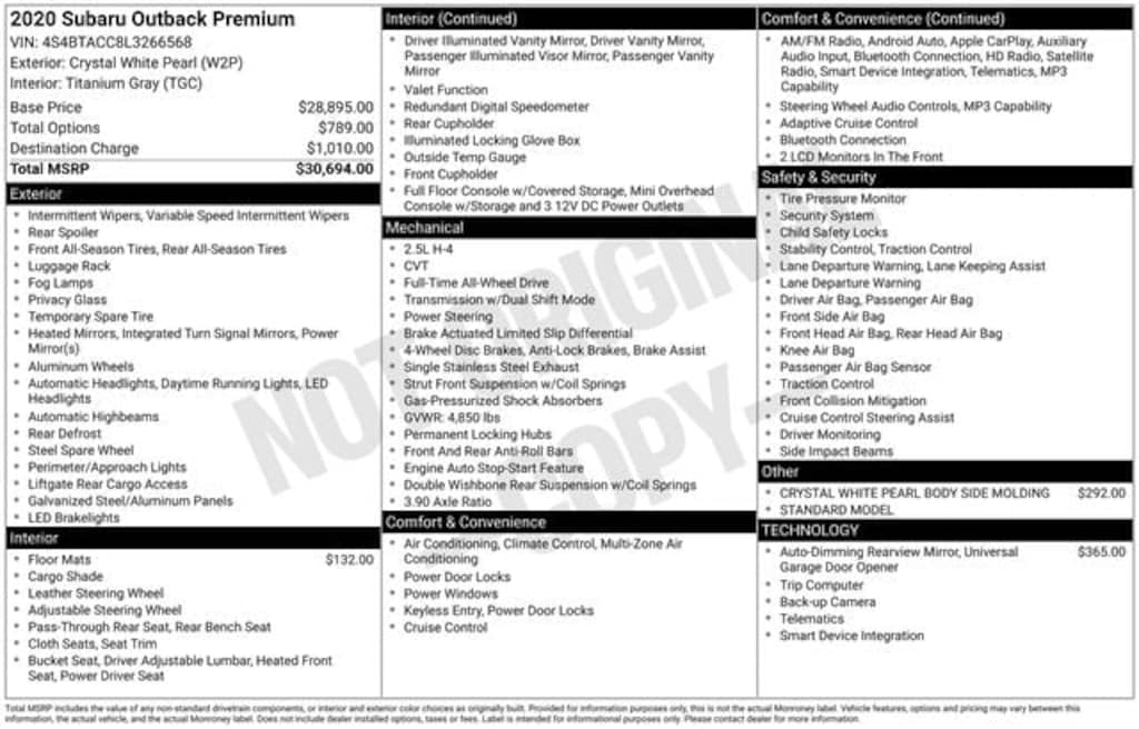 Discover the perfect blend of capability, technology, and style in this 2020 Subaru Outback Premium. Schedule a test drive today and experience the difference for yourself. We're confident you'll be impressed by this exceptional vehicle and its uncompromising Subaru quality.